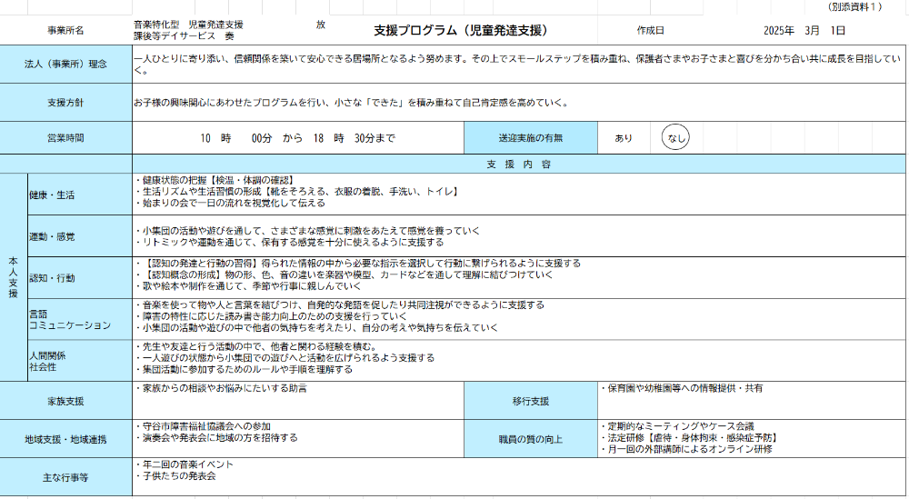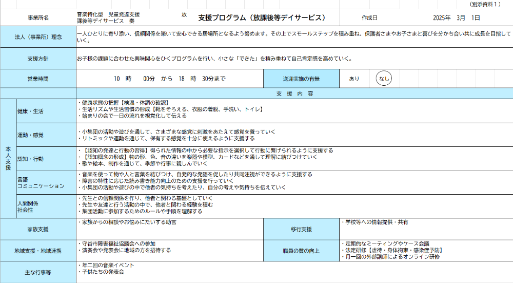 | 施設名 | 音楽特化型児童発達支援放課後等デイサービス 奏 |